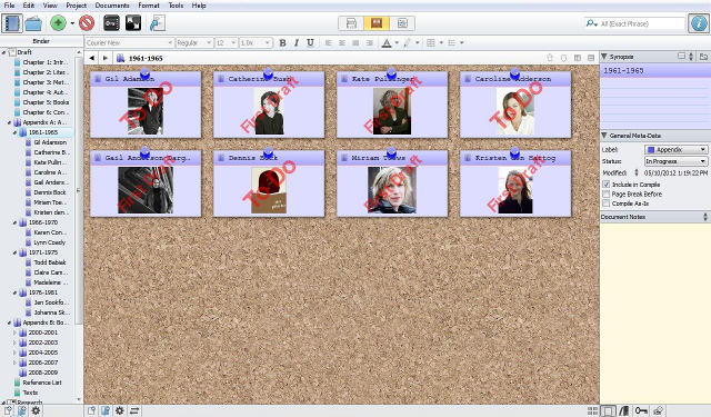 • I follow Scrivener on Twitter and I happened to see a tweet about displaying images in the corkboard instead of the index card—great tip! Started adding author photos for the author pages + book covers for the book pages.